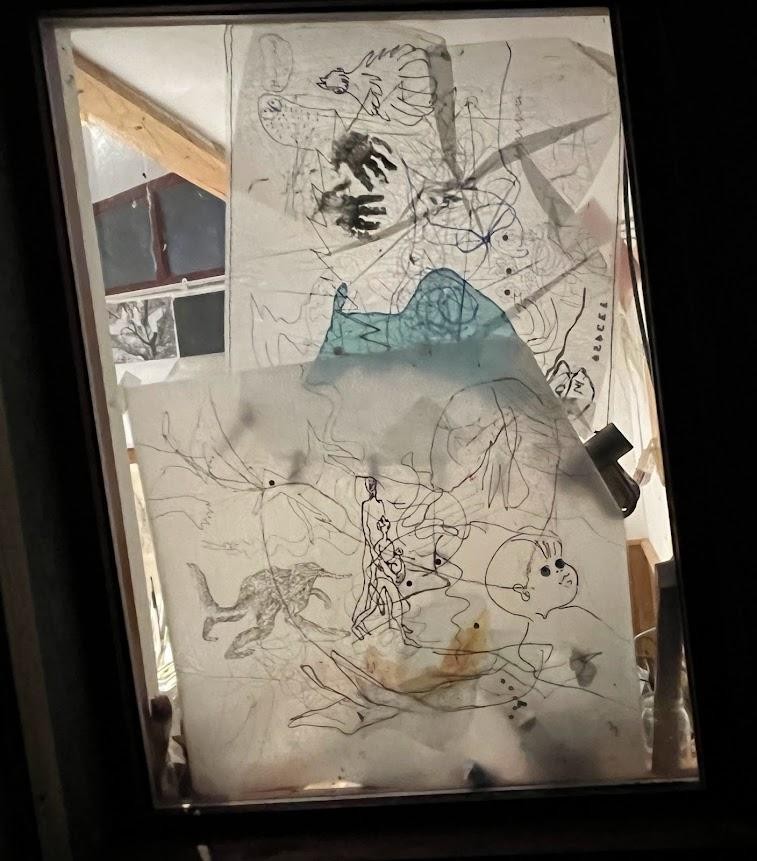 A View into my Studio from the outside and Finlay’s tape. In order to experience the effect we had to use a torch and to turn all lights off. Molly’s creature wears glasses. She wants it to see it.